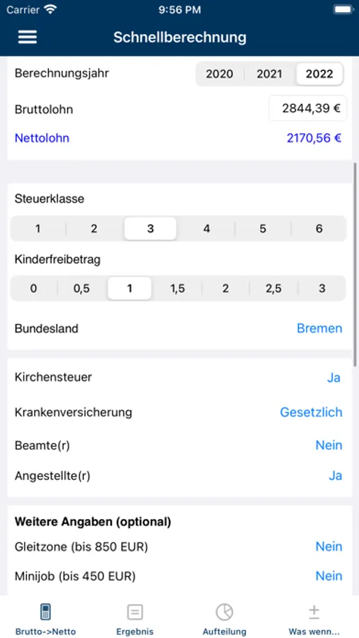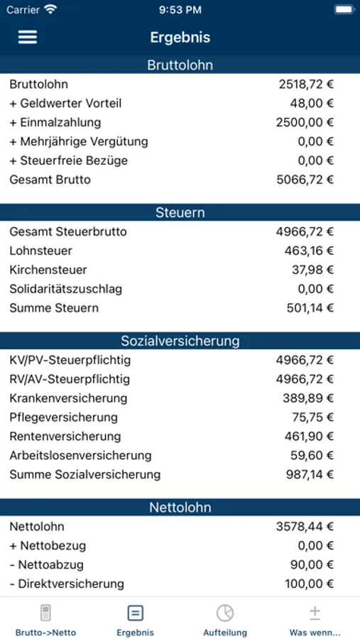 Im Berechnungsergebnis wird Ihre Lohn- und Kirchensteuer, sowie der zu zahlende Solidaritätszuschlag ausgewiesen.