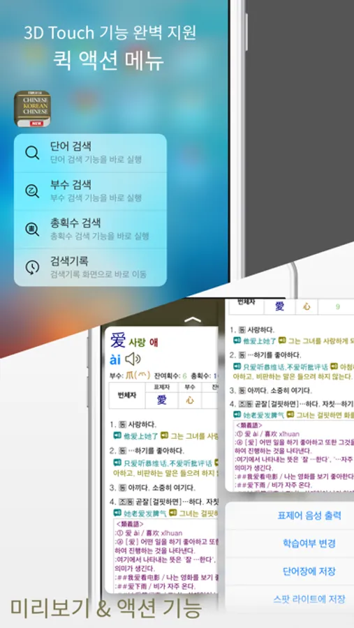 - iOS 7.x 이상에서 예문 문장 Text To Speech 기능 지원(환경설정에서 켬/끔 설정)