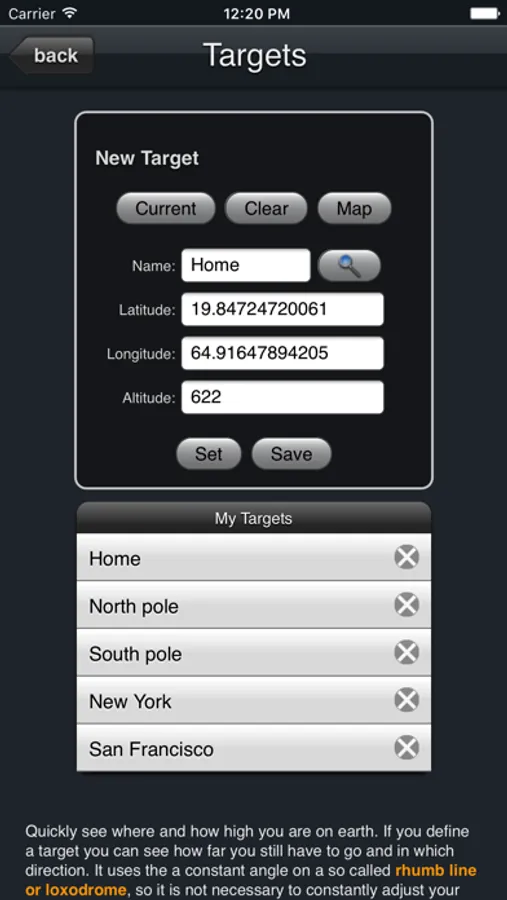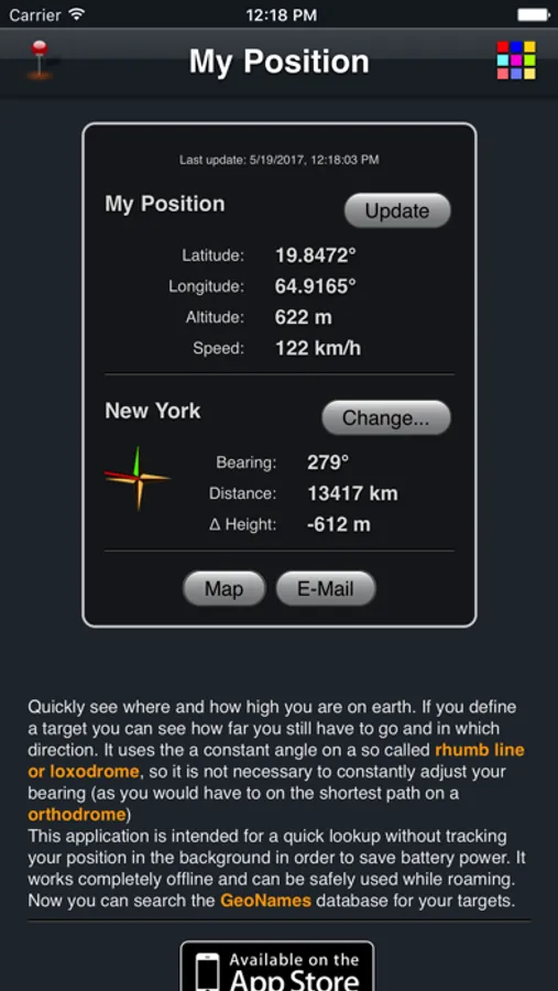 Quickly see where and how high you are on earth. If you define a target you can see how far you still have to go and in which direction. It uses the a constant angle on a so called