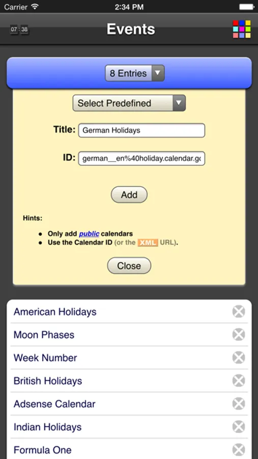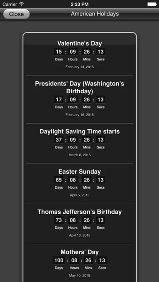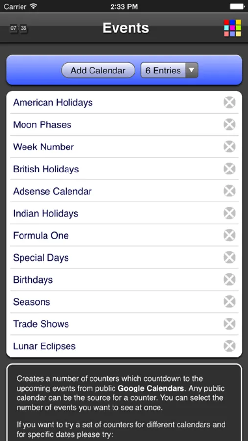 Creates a number of counters which countdown to the upcoming events from public Google Calendars. Any public calendar can be the source for a counter.