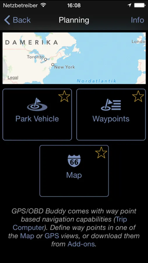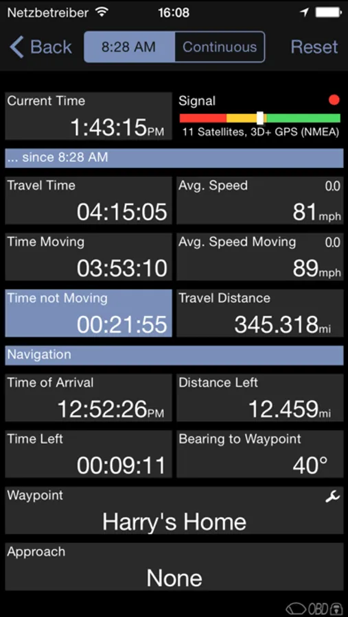 Harry's GPS/OBD Buddy is a versatile trip computer and GPS / OBD data monitor. The trip computer records distance and time traveled, and calculates average speeds. Using the navigation module from Harry's GPS Suite, GPS/OBD Buddy will furthermore forecast arrival times using waypoints.