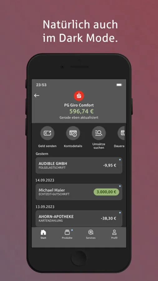 Use the search function across accounts and bank details, set up a budget book (offline account) for budget planning and view graphical evaluations of your finances. You have a direct line to your Sparkasse via app and access to many services such as card blocking, notifications, notepads, appointments and even the account opening via app (if offered by your Sparkasse). On top, you can switch directly to the app S-Invest and place securities.