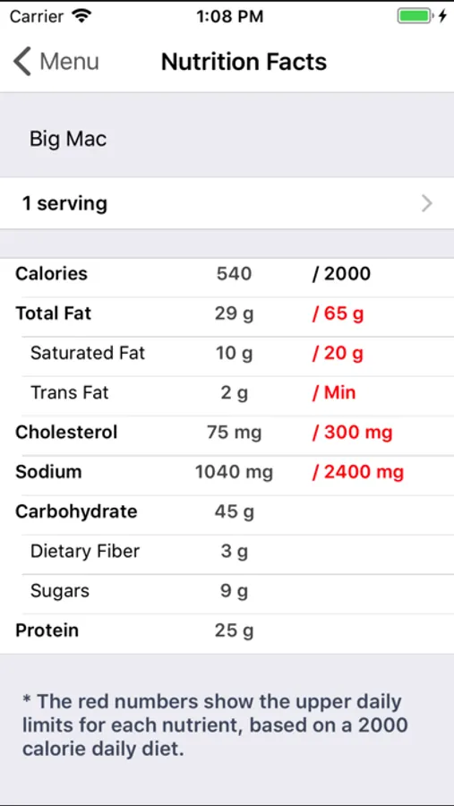 * Displays recommended upper limits for Total Fat, Saturated Fat, Trans Fat, Cholesterol, Sodium