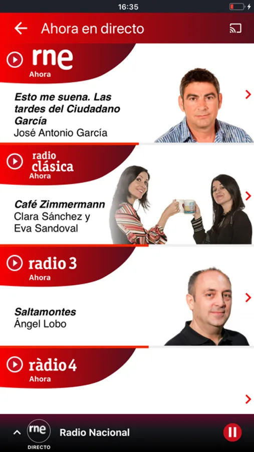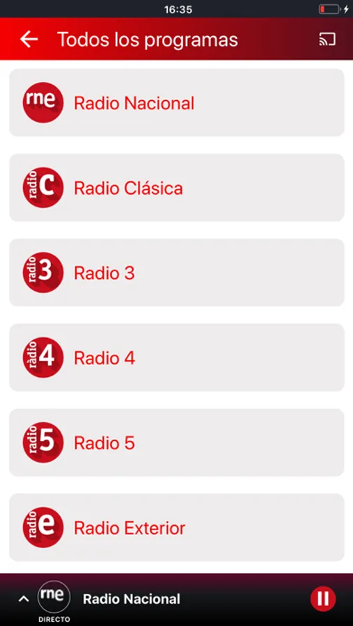 Todas las emisoras de Radio Nacional de España (RNE) en directo y bajo demanda. Conecta con los programas en directo y escucha los podcast cuando quieras. Disponible para su descarga en todo el mundo. Incluye la opción de búsqueda por programa.