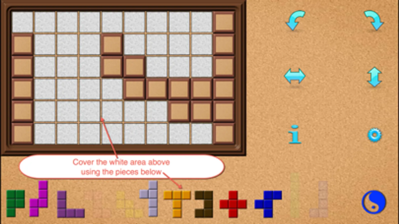 After you choose a board size and difficulty level, PentoMind will generate an appropriate new puzzle for you to solve. Your job is then to place the pieces at teh bottom of the screen so that each white square of the board is covered by some pentomino.