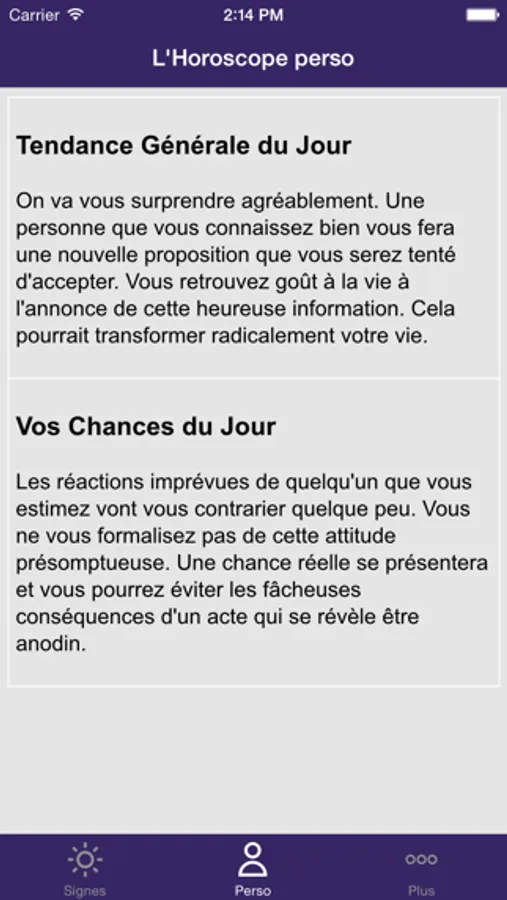 Chaque jour, vous pourrez consulter gratuitement Votre Horoscope Personnel Complet. Vous y trouverez 7 rubriques détaillées qui souhaitent répondre à vos interrogations sur les principaux thèmes relatifs à votre vie personnelle: La Tendance Générale du jour, Vos Chances, Vos Finances, Les Sentiments, Votre Forme, Votre Moral, Les Opportunités du Jour et... Le Proverbe du Jour. En plus, vos 7 chiffres de Chance pour vos jeux !