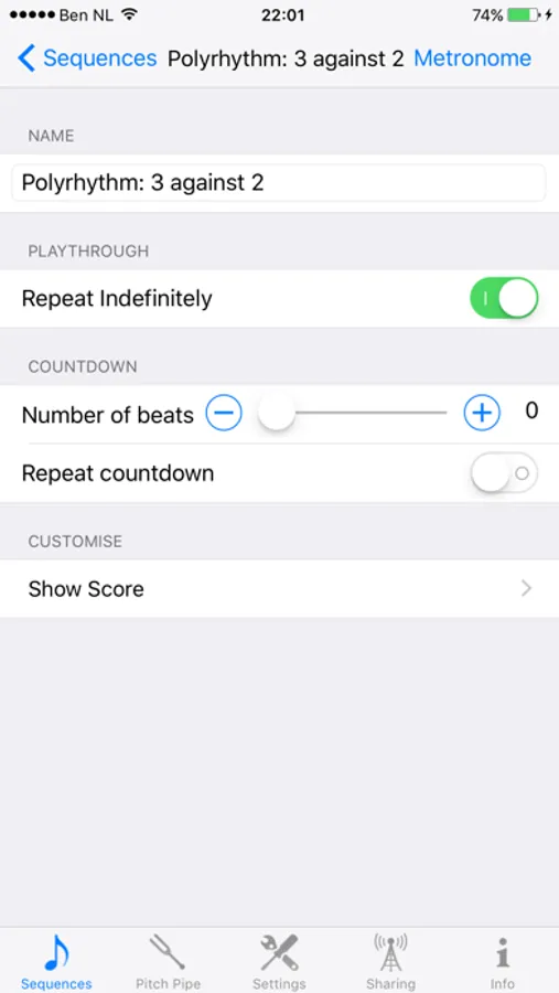 • Each sequence can set a countdown, and also whether the metronome stops at the end of the sequence or continuously repeats the sequence. You can also choose to have the countdown repeated with every repeat of the sequence.