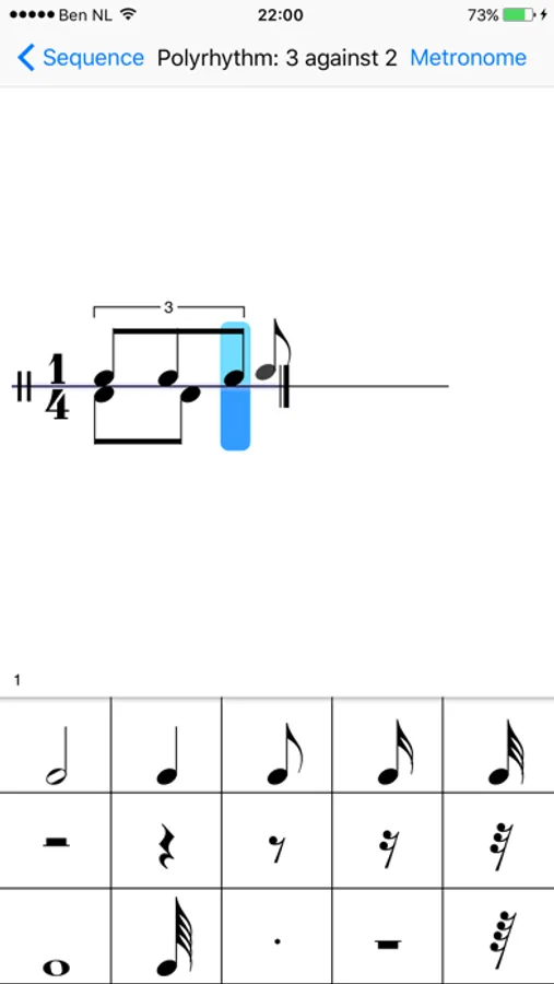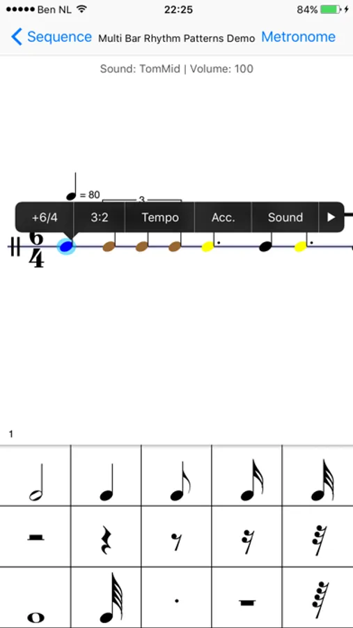 • Freely enter notes into bars to create rhythm patterns (like triplets or swing, or most any pattern you like). You can assign a custom color, sound and volume to any beat or any rhythmic component of a beat. You are in control. You can keep it as simple as you like, or make it as intricate as you need.