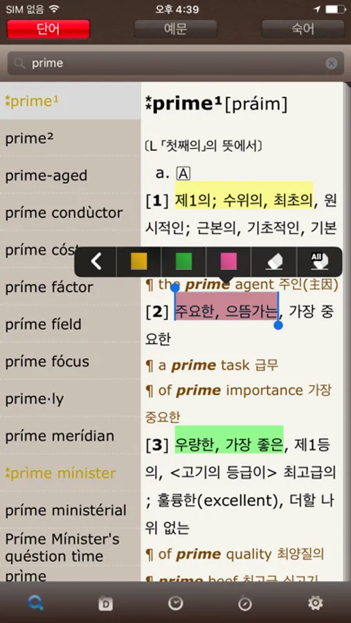 사전 본문을 길게 눌러 상단 ‘highlight’메뉴를 탭하여 주세요.