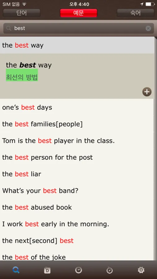 4. 예문/숙어: 단어처럼 자유로운 한/영 검색 기능은 물론 저장 및 점프 기능까지 지원