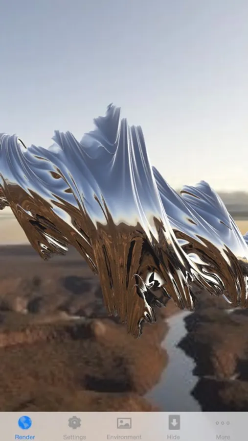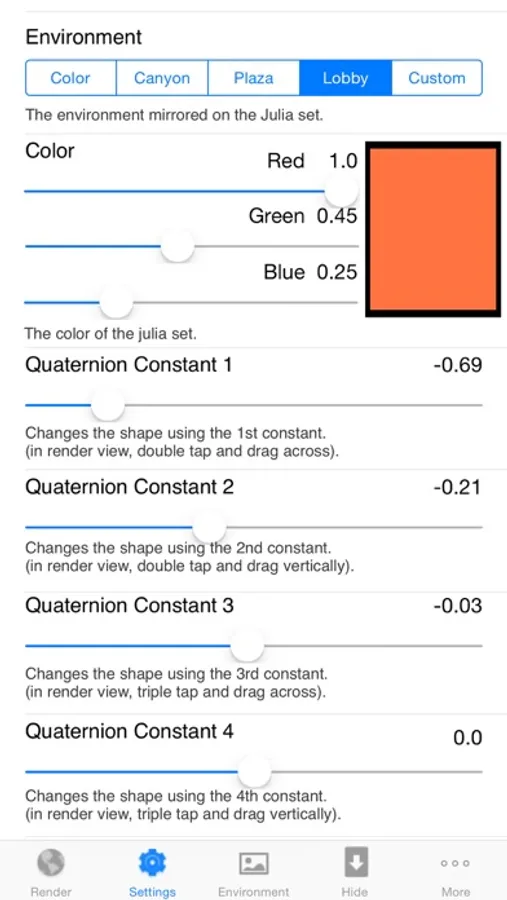 Double/Triple tap and drag the finger horizontally or vertically to change the shape of the quaternion Julia fractal. You can also set these constant in the Settings tab. The Settings tab also allows to enable an environment that is mirrored on the Julia set. The accuracy of the fractal surface can also be set here. If you have red-cyan glasses available, you can see the fractal with real depth by enabling stereo mode.