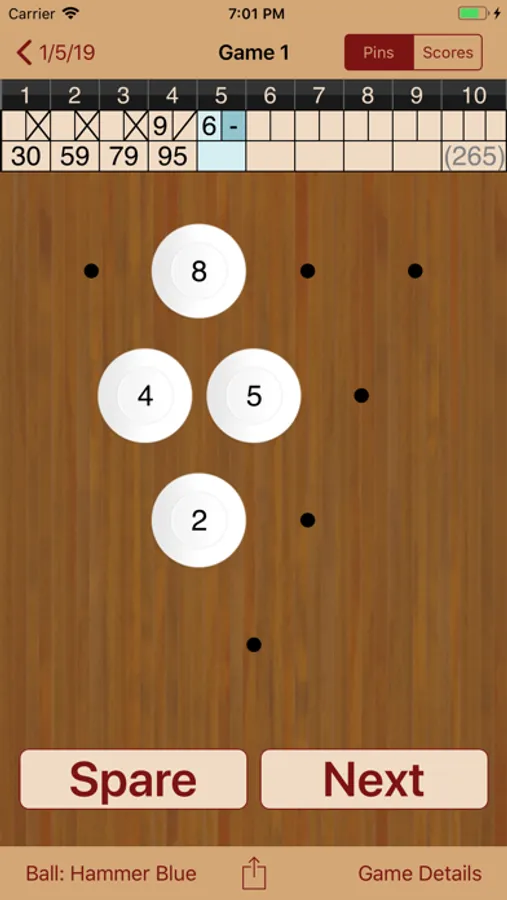 Scores can be entered either by selecting all the pins you knocked down or entering the scores you get for each ball. Also, if you don't want to take the time to enter each frame, you can just enter the final score for the game.