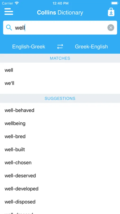 • Search autocomplete helps you find words quickly by displaying predictions as you type.