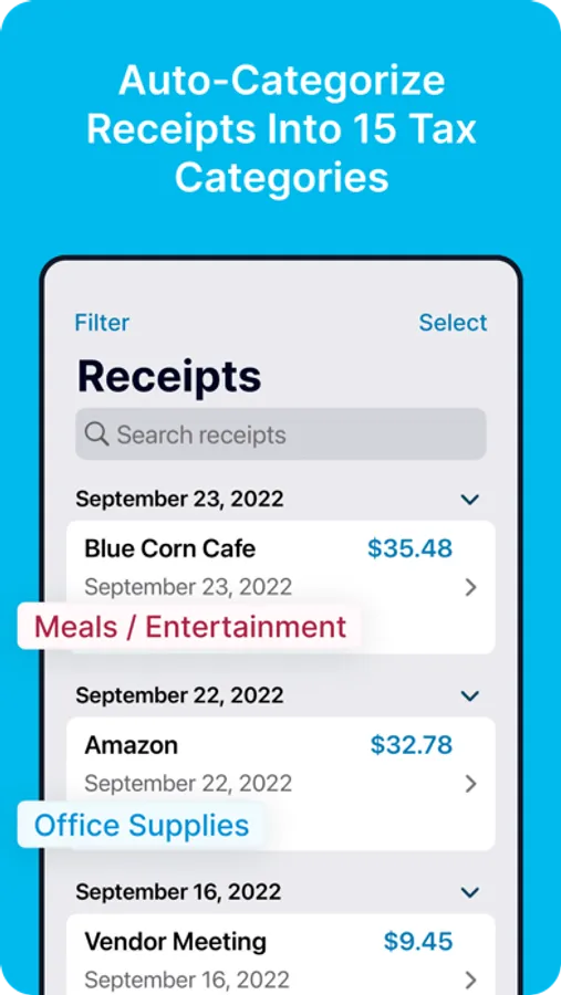 * Automatically categorize receipts into 15 of the most common tax categories.