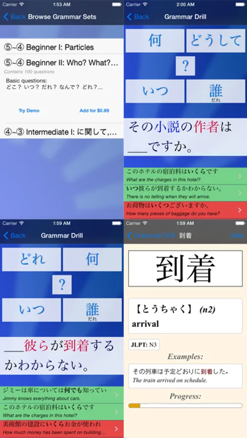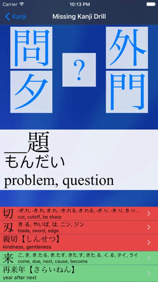 • Drill mode helps you train on kanji, vocabulary, word reading and kana.