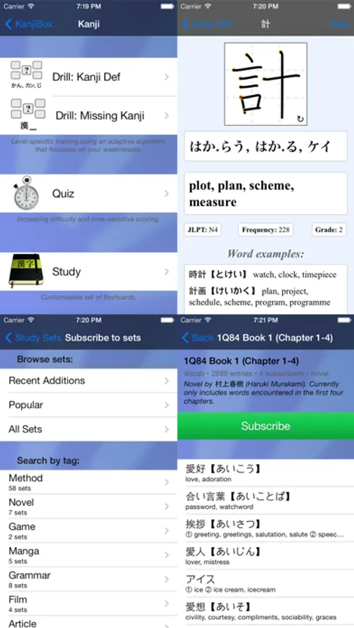 • Custom Study Sets let you pick your own set of vocabulary words or kanji to focus on.