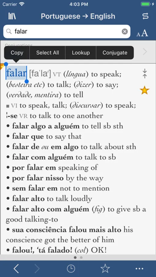 Carry a dependable Portuguese and English reference everywhere you go with the Collins Pro Portuguese-English Translation Dictionary. This app contains dictionary data from HarperCollins in our popular Ultralingua interface. Use our verb conjugation tool to find complete conjugations of thousands of verbs in all standard forms, and the number translator to convert numerals into Portuguese or English text instantly.