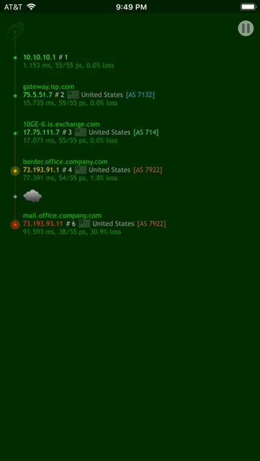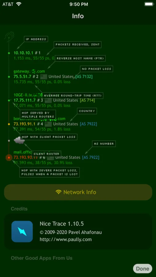 Keep your network under control with Nice Trace - the most advanced traceroute app for iOS. The tool traces the route to the host in the Internet using easy, user-friendly interface and animations. You will immediately get information about any possible bottlenecks and problems since Nice Trace never stops working. It continues to monitor the whole path to the network resource in real time and keeps you informed.