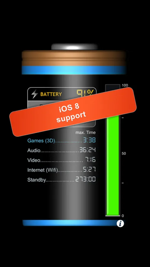 ► The most reliable battery app: remaining battery life for all iOS devices with iOS 8 and higher