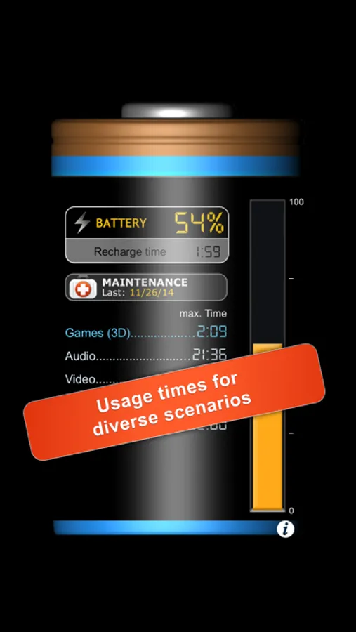 iBattery Pro is a tool that displays the current battery level of your iOS device using a percentage output and a bar indicator. iBattery Pro additionally displays the remaining time in hours and minutes for the most common usage scenarios of your device: