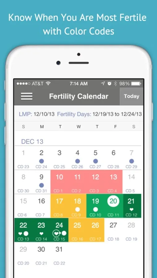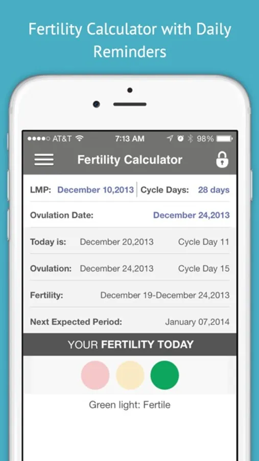 • NEW: Fertility Calculator with daily reminders. RED/YELLOW/GREEN traffic light to let you know when you are most fertile. And, when not! Helps you pinpoint your fertile and less fertile days and help you get pregnant faster. Or NOT!!