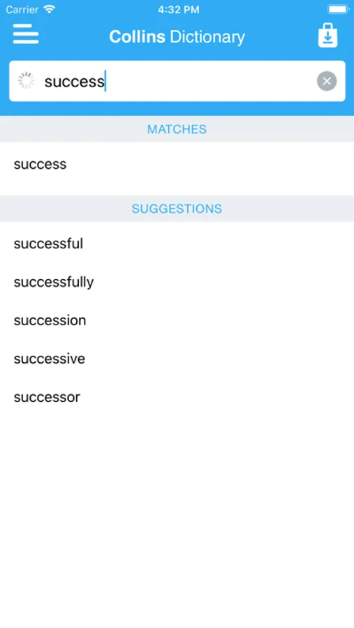 • Search autocomplete helps you find words quickly by displaying predictions as you type.