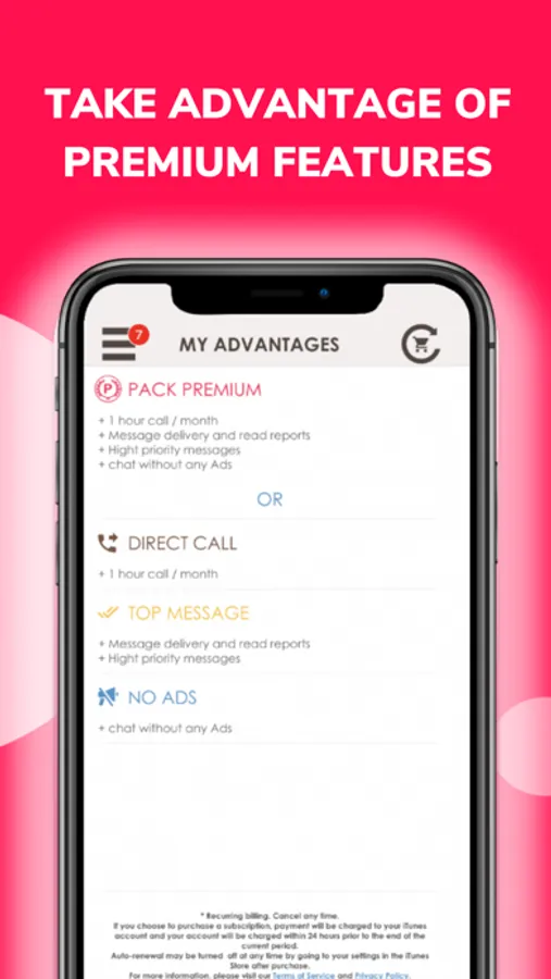 If you choose to purchase a paid subscription, your payment will be made through your iTunes account, and the amount will always be debited 24 hours before the end of each period. Your subscription will automatically renew until auto-renewal is turned off at least 24 hours before the end of the current period. You can turn off auto-renewal at any time in Settings in the iTunes Store. The Premium Pack subscription is only offered at € 7.99 and it contains the 3 other subscriptions: TOP MESSAGE, ZERO ADS, DIRECT CALL