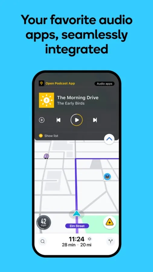 • Use your favorite audio apps (for podcasts, music, news, audiobooks) directly within Waze