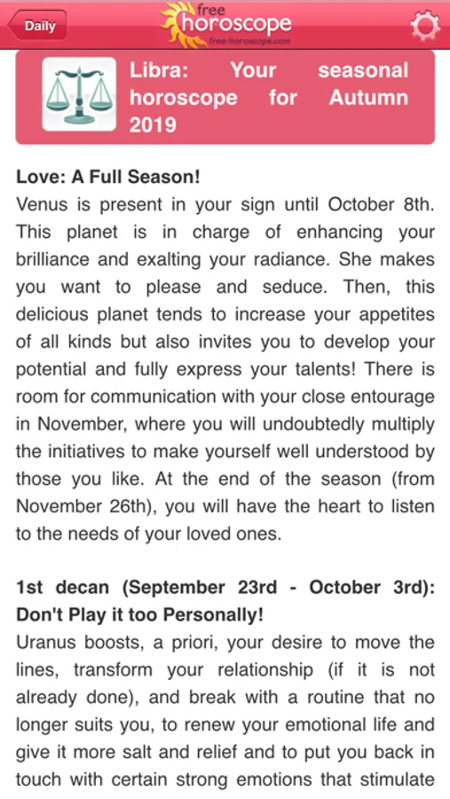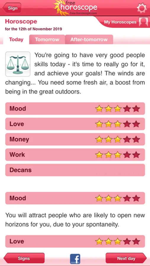 Download the new version of Free Horoscope to access all your daily horoscope for free, with an emphasis on your horoscope for your love-life, finances, work and mood. All these features are provided by our team of certified astrologists.