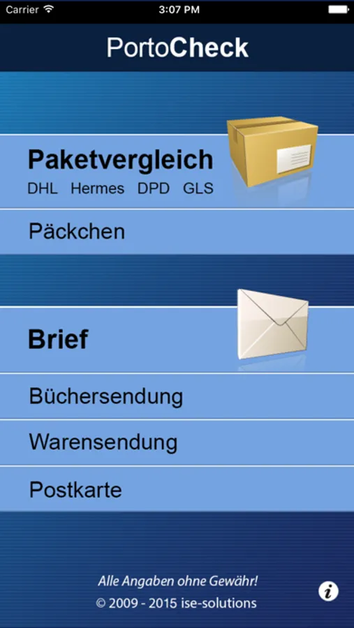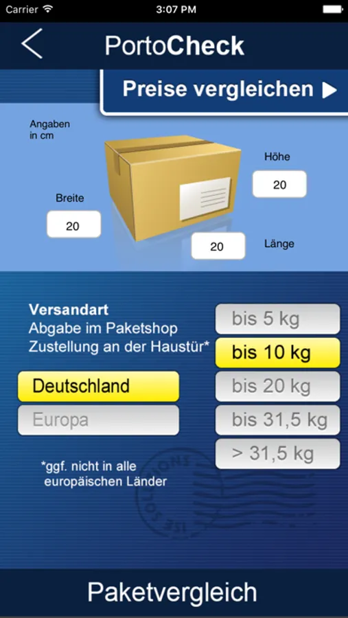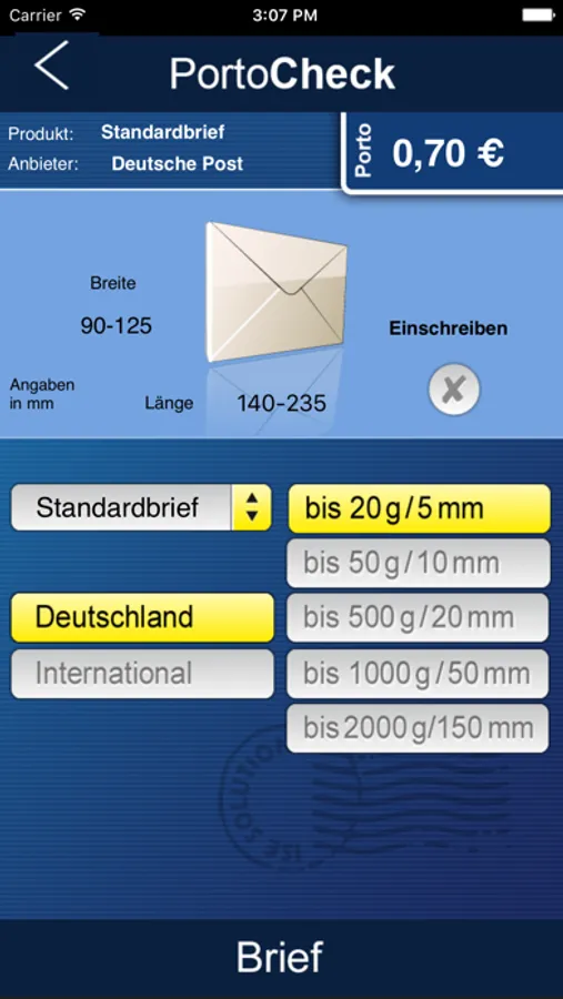 PortoCheck stellt in einem übersichtlichen, intuitiven Interface Portogebühren für Pakete und Briefe dar.