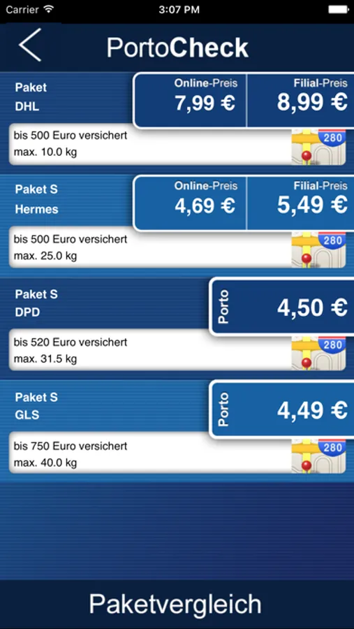 Einzigartig ist der Paketpreis-Vergleich: anhand der genauen Paketgröße und des Paketgewichts werden die Gebühren von der Deutschen Post/DHL, Hermes, DPD und GLS gleichzeitig dargestellt und können verglichen werden. Deutschland- und europaweit! Die nächste Paket-Filiale kann mit einem Klick auf der Anbieterseite gesucht werden.