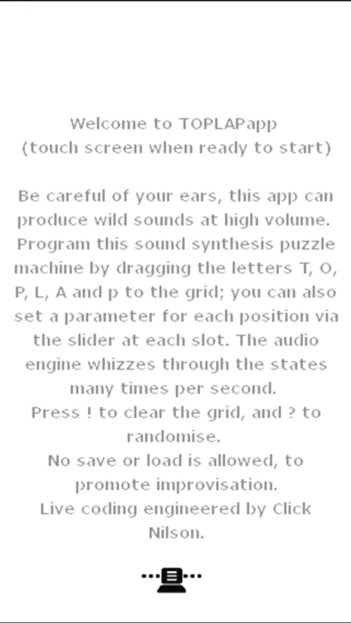 TOPLAPapp is a sonic puzzle based around a virtual machine for sound synthesis. This machine accepts a few valid instructions represented by the letters T, O, P, L, A, and p, and you control it by placing each command letter within a grid, along with setting some associated parameter sliders. The machine rushes through the instruction set to create output sounds, which are usually of a somewhat noisy character, hopefully interestingly so. The historical antecedents include instruction synthesis as pioneered at the Institute of Sonology in the 1970s, and the live coding movement, of modifying a running program as it acts. This app is intended for those interested in more experimental sonic art: don't download unless you are open to stranger computer music sounds ((http://www.toplap.org).
