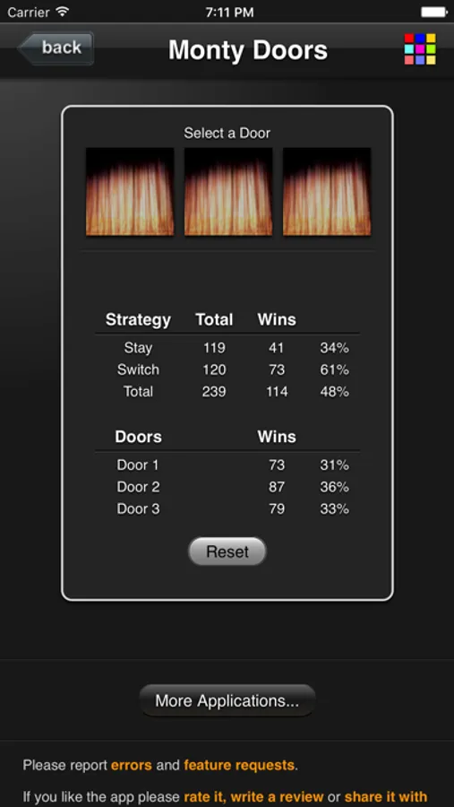 In case you wonder, the simulation is based on pure random choices of the doors. There is no hidden algorithm or sneaking involved.