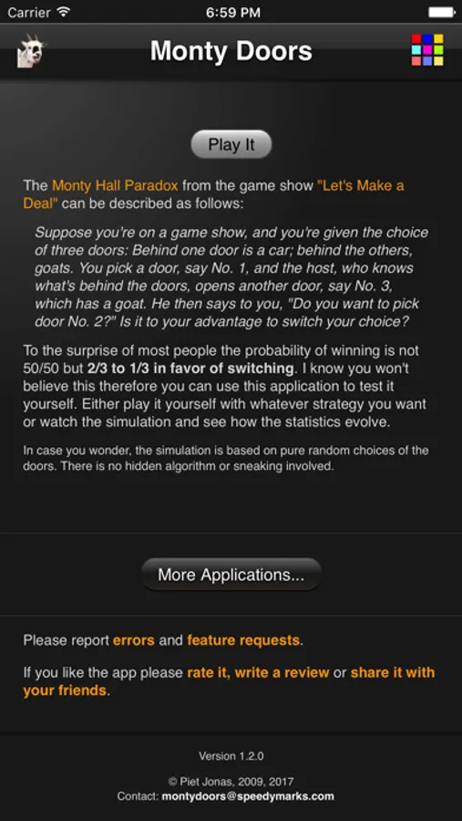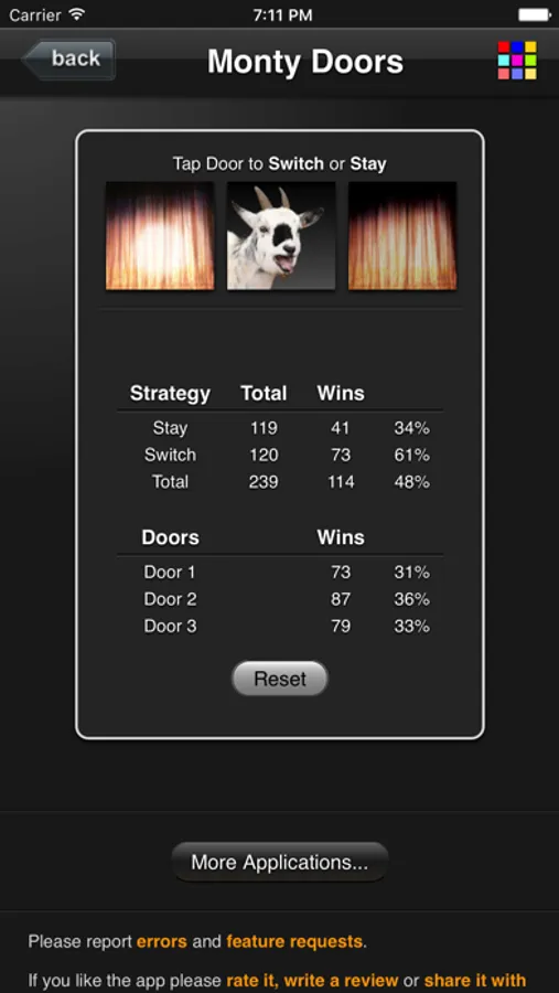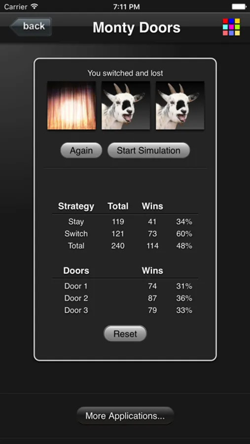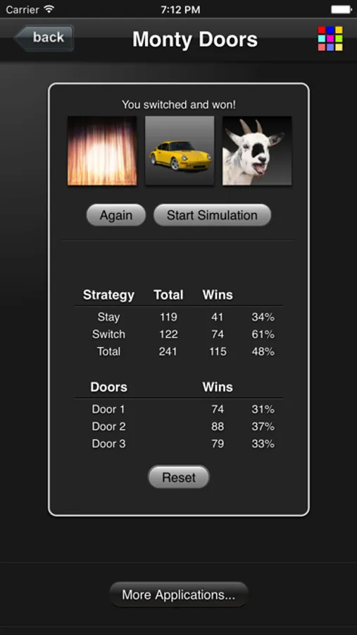This application let's you play the game yourself or run a long simulation to prove the surprising probability of winning when you switch the doors.