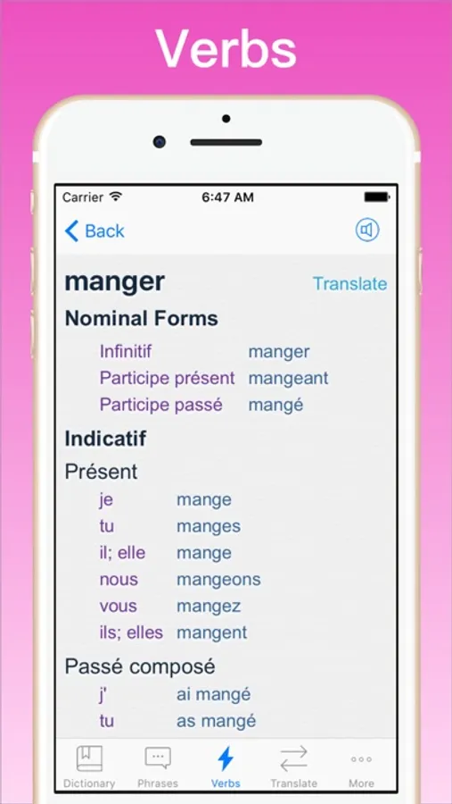 • Best verb conjugator of any app including 7,679 French verbs, 4,318 English verbs. Over 1,329,730 verb forms in all!