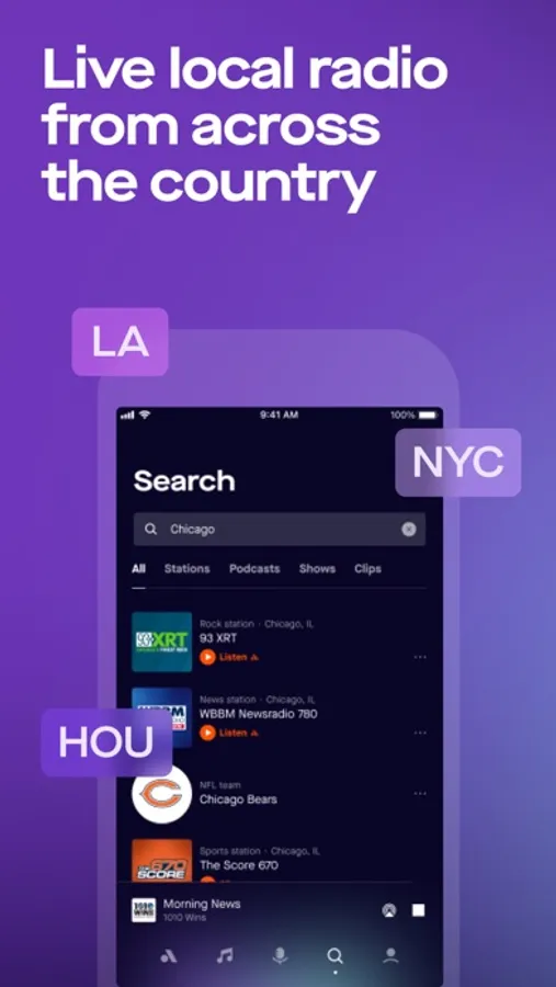 Streaming audio of top FM and AM local radio, including V103 (Atlanta), 106.7 KROQ (L.A. and Orange County), 93 XRT (Chicago) and more. On demand stations for every mood, with tracks selected by music lovers, not machines.
