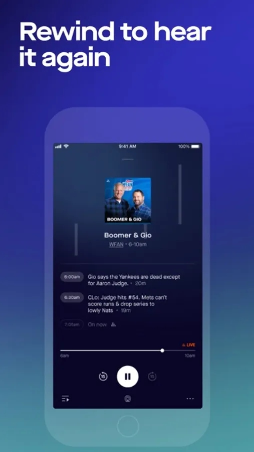 > Rewind your sports and news stations to the beginning, or save your spot by pausing live radio.