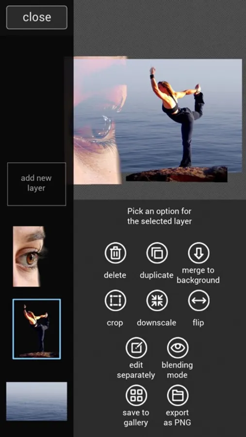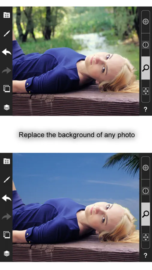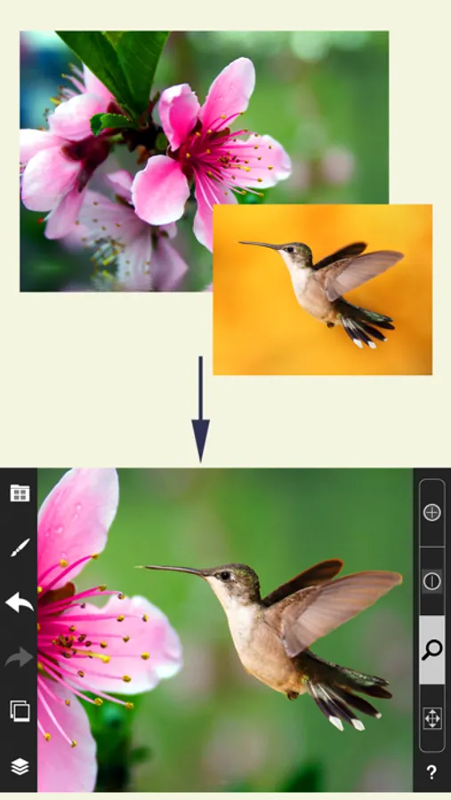 With this app you have complete freedom over which parts of the photos you want to keep. You can remove (or re-add) parts of the images with your fingers, like painting. Change the settings of the brush for fine-tuning. With this technique you can create montages, replace backgrounds or combine pictures any possible way you can imagine. You can also create semi-transparent layers of photos.