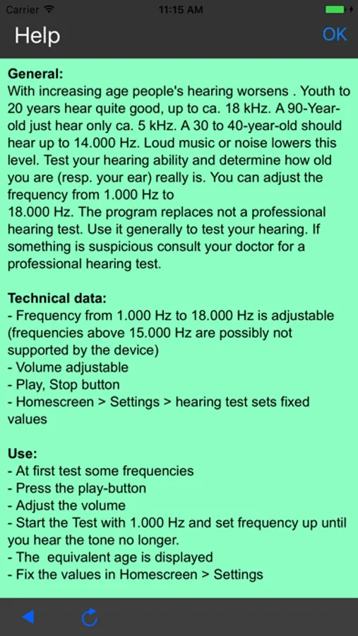 With increasing age people's hearing worsens . Youth to 20 years hear quite good, up to ca. 18 kHz. A 90-Year-old just hear only ca. 5 kHz. A 30 to 40-year-old should hear up to 14.000 Hz. Loud music or noise lowers this level. Test your hearing ability and determine how old you are (resp. your ear) really is. You can adjust the frequency from 1.000 Hz to