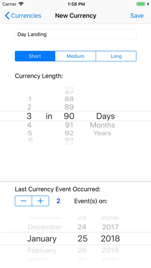 Add a new currency. Choose your own name, group (short/medium/long term) and Length. Supports "3 landings in 90 days" styles of currencies.