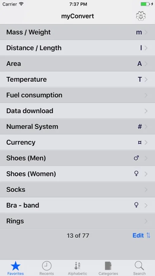 List of categories from PAID version: Mass, Distance, Area, Temperature, Volume, Density, Volumetric Flow, Fuel consumption, Pressure, Time, Frequency, Timecode/Frames, Video length/space, Speed, Acceleration, Energy, Power, Force, Torque, Angle / Trigonometry, Navigation, Angular velocity, Resistance, Radioactivity, Carbon 14 Dating, Data storage, Data download, Numeral System, Luminance, Illuminance, SI prefixes, Currency, Suit/coat/sweater, Dress/suit, Shirts, Blouse/sweater, Shoes (Men), Shoes (Women), Socks, Stockings (Women), Dress (Juniors), Bra - band, Bra - cup, Hats, Rings, Electric current, Electromagnetic spectrum, Radiation absorbed, Moment of Inertia, Viscosity (dynamic), Viscosity (kinematic), Metal Hardness, Circular, Typography, Concentration (solution), Concentration (molar), Radiation, Radiation exposure, Musical Intervals, Musical notes, Sound level, Angular acceleration, Paper Weights, Resistivity, American wire gauge