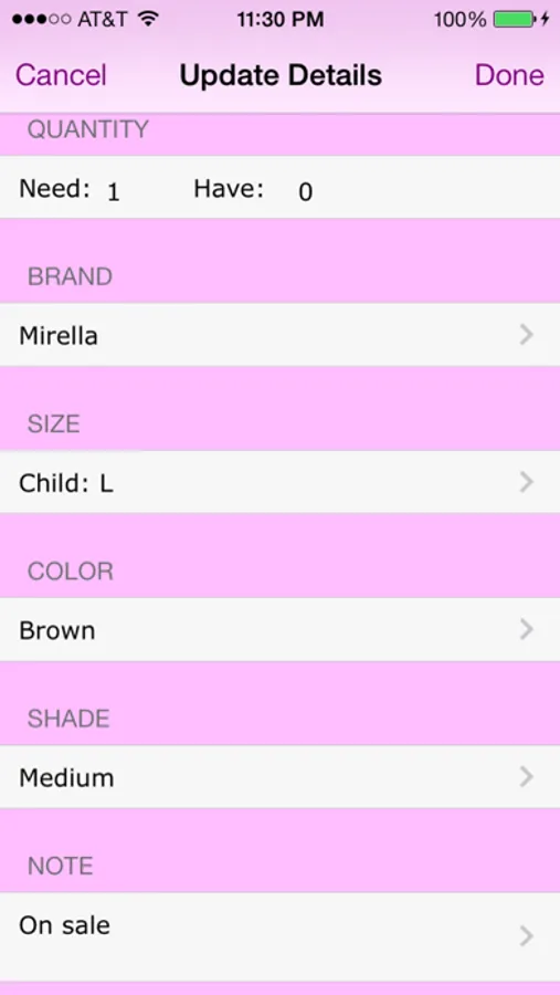 - Choose brand, size, color, and shade for each item using preset items from the database – or you can add your own!