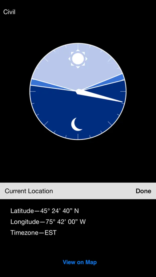 This application will use your current location to compute sunrise and sunset times, as well as twilight period for Civil, Nautical and Astronomical twilight.