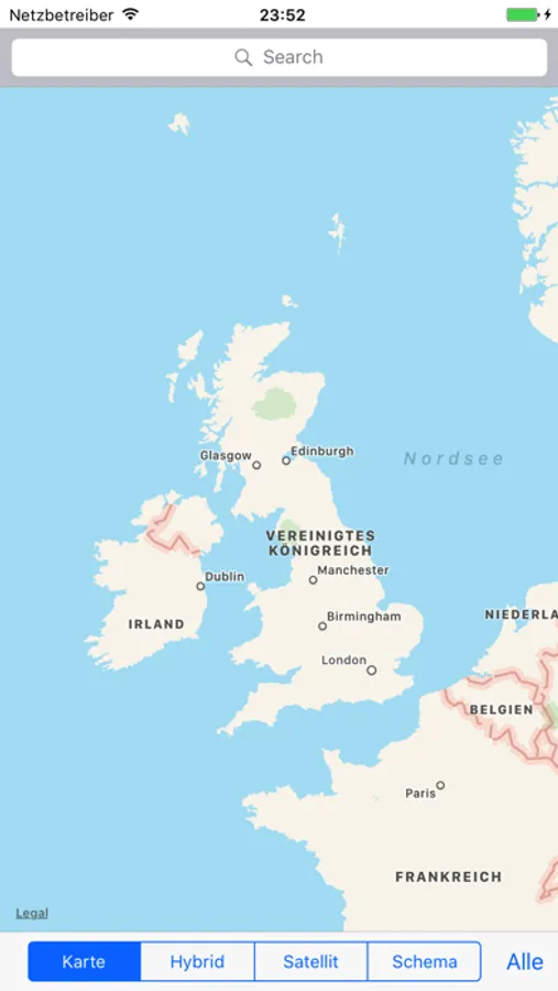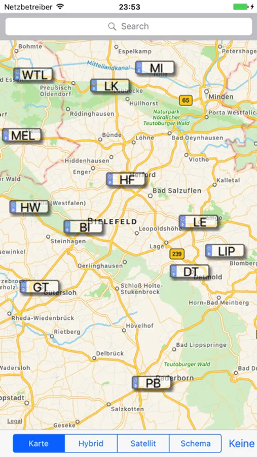 In Apple Maps kann zwischen den bekannten Ansichten Karte, Hybrid und Satellit gewechselt werden. Der Reiter "Schema" zentriert die Kreisgrenze des gesuchten Nummernschildes und ist im Offline-Modus (z.B. mit dem iPod touch) benutzbar. Schema zeigt außerdem über unterschiedliche Farben die verschiedenen Bundesländer an. "Alle" blendet in Apple Maps alle Kennzeichen ein (Wechsel zwischen Karte, Hybrid und Satellit möglich), "Keine" wechselt zurück. Alle Karten sind mit Doppeltippen oder der 2-Finger-Methode (Bildrahmen auf- oder zuziehen) zoombar.