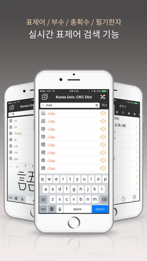 고려대학교 민족문화연구원에서 출판한 "전면 개정 中韓辭典"과 "개정판 韓中辭典"의 모든 표제어를 탑재하였으며, 간편하게 휴대하면서 원하는 장소 어디에서든 쉽고 빠르게 단어를 검색하여 내용을 확인할 수 있습니다.