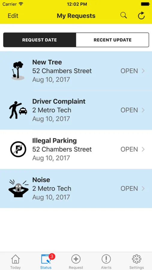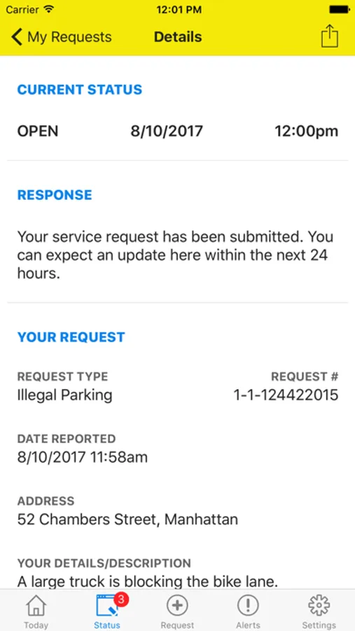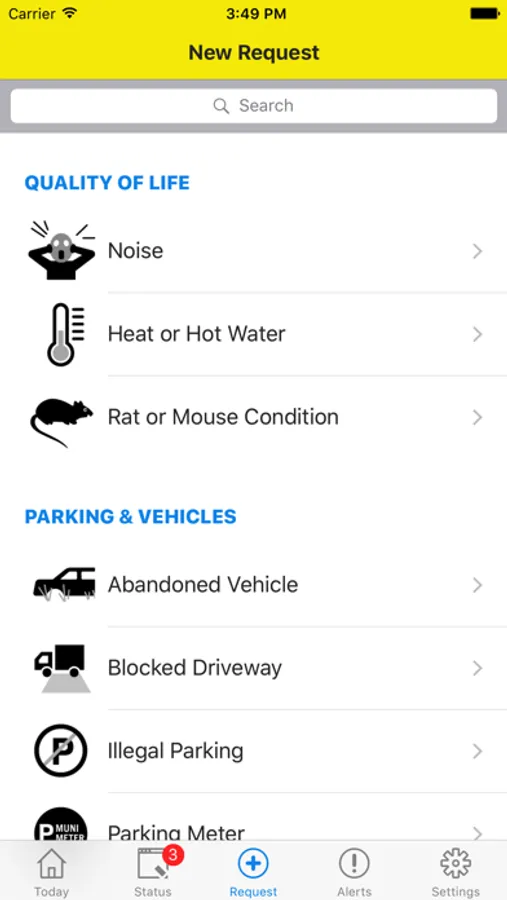 • Report problems. See an issue in your neighborhood? You can easily file Service Requests for noise, illegal parking, dirty sidewalks, and much more.