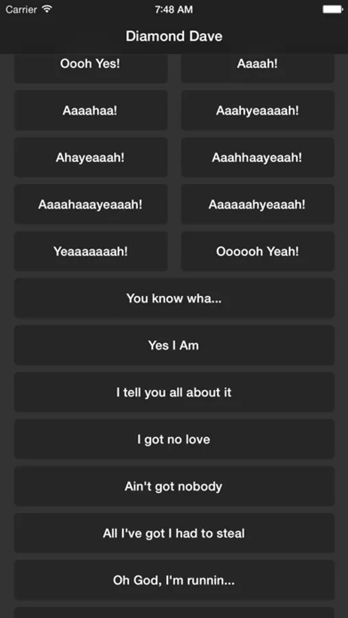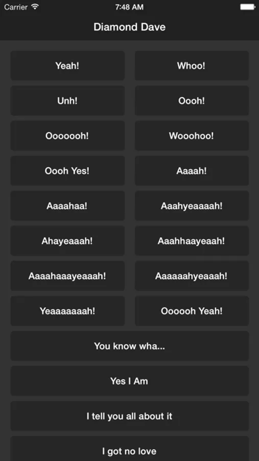 Diamond Dave features 24 different clips of rock legend David Lee Roth, including over 6 variations of "Yeah!" including "Ooooooo Yeaaaahhhh!" and "Aaaaahhaaaayeeaaaah!"