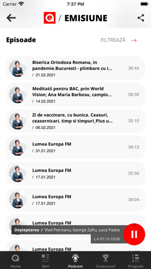 Aplicația oficială Europa FM îți dă acces la emisiunile Europa FM, radio live, podcasturi, video cu programele favorite, acces simplu la știrile care contează, dar și alerte de fiecare dată când se întâmplă ceva important!
