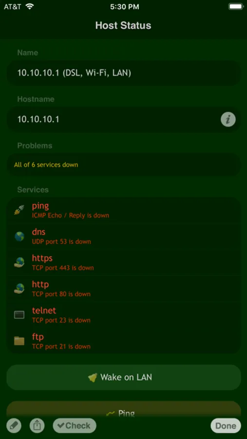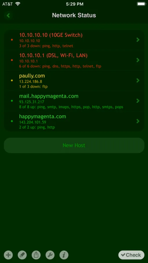 The tool checks network services your hosts run for availability and presents the information in a convenient way in order to speed up the diagnostics of network problems. With Net Status you can quickly and easily determine which hosts and services are down from your monitoring list.