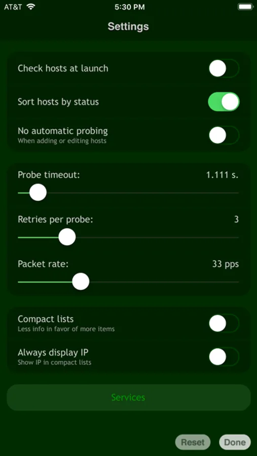 Net Status employs asynchronous algorithms that allow Net Status to operate really fast. Fractions of a second are needed to check a host with quite a number of running services. Even problematic hosts won't slow down the check process for a time much longer than a timeout you specify.